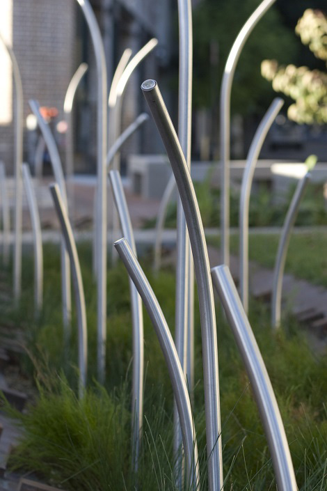 The light reeds concept design was refined in house for buildability and vandal resistance. To combat the potential to bend rigid reeds poles we designed a dual base plate and spring assembly so that the poles would move when pressure was applied.