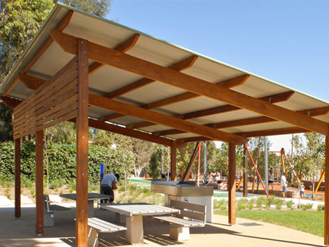 The Town & Park SKILLION SHELTER is a large shelter that has been designed to provide coverage for multiple table settings and BBQ units. This shelter has an angled roof design which can be used to provide shade in open park settings and seaside locations. This shelter can be customised to suit almost any size with several additional options available.