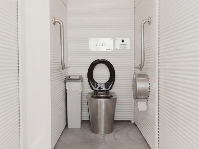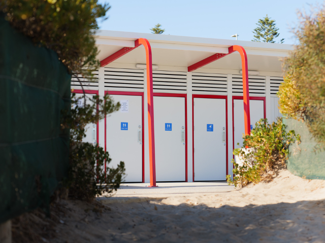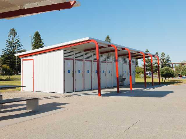 Modus' resulting design was a customised version of the Yarra 6 Prefab Washroom Buildings, with seven cubicles, an accessible toilet and two showers, plus a staff-only servicing area for maintenance. Prefabricated offsite, Yarra 6 is a versatile design, engineered to endure strong wind loads, constant salt air exposure and marine environment corrosion.