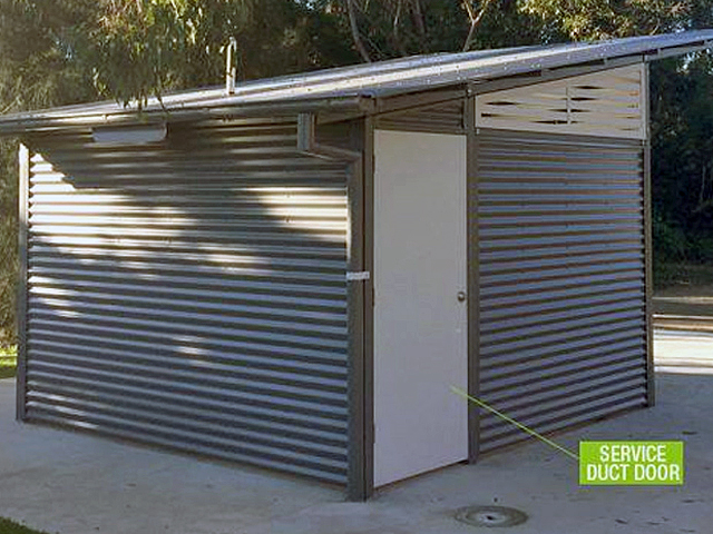 The service duct at the rear allows for easy maintenance and access to plumbing services, and the skillion roof offers additional shade and shelter for park visitors.