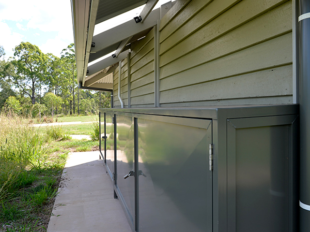 The hip-roofed structure based on Landmark’s Beechworth series, adheres closely to the standard Queensland Parks and Wildlife design, including enclosed cisterns on the outside in a pre-fabricated metal cabinet.