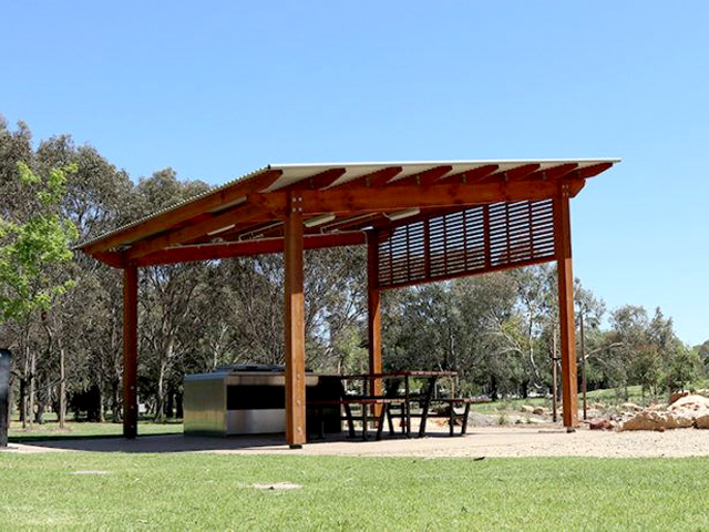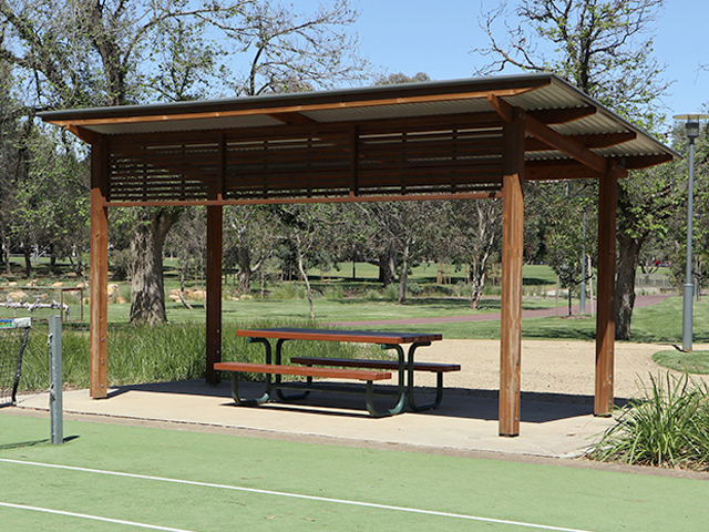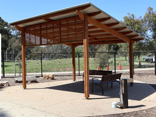 Two 5×5 metre Peninsula shelters in the playspace provide shade for parents and children who visit. Another four Peninsula shelters are in the two dog parks – two each in the small dog and larger dog parks.