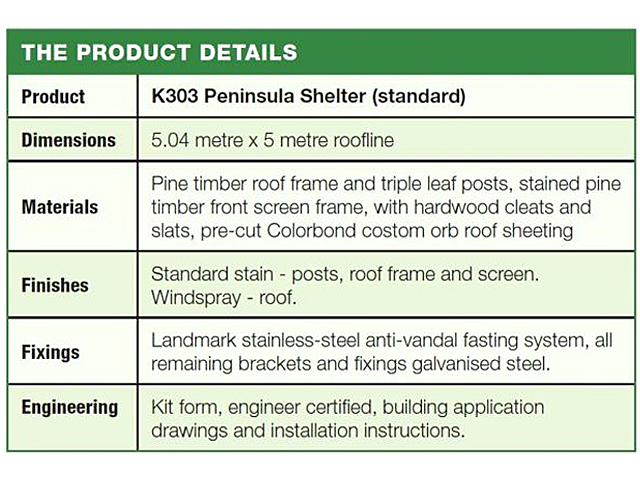 Each of the shelters are secured with inground pine posts, finished with standard stain, and were delivered in kit form, flat-packed.