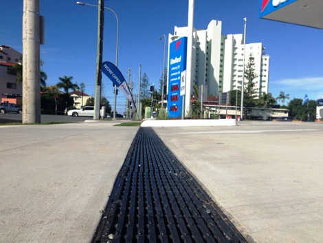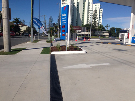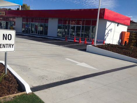 The newly refurbished United Service station in Labrador, on Queensland’s Gold Coast, was completed in early 2015. This project was supplied with Hydro’s polymer concrete drainage channels with integrated cast iron edge rails and new style longitudinal ductile iron heelguard grates. The Class E grates are load rated to a whopping 13, 700kg and can handle any heavy traffic that drives across it.
